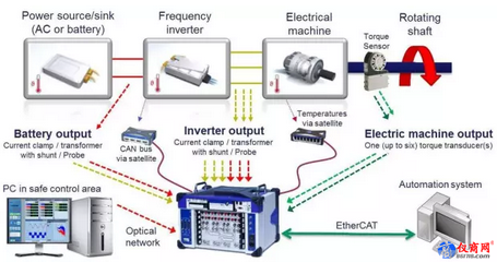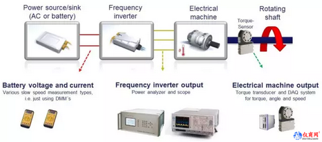 電池電壓和電流通過數(shù)字萬用表測量,逆變器的輸出通常采用傳統(tǒng)的功率分析儀進行測量,并且有時采用示波器來查看信號。為了測量機器輸出,一般使用扭矩傳感器和數(shù)據(jù)采集系統(tǒng)。不幸的是,傳統(tǒng)測試有以下幾個問題: