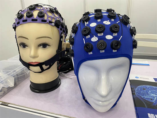 章祥:是的,之前所有的應(yīng)用都是基于人的枕區(qū)腦電信號(hào)采集,只用后面的8導(dǎo)頭帶就可以。我們?yōu)榱瞬杉X腦電信號(hào),今年推出了這個(gè)全腦64導(dǎo)的腦電帽。