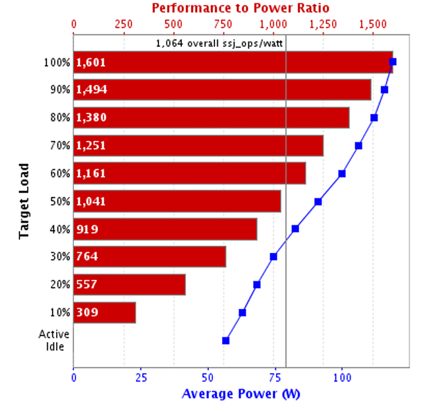 SPECpower?是由SPEC(標(biāo)準(zhǔn)性能評(píng)估組織)開發(fā)的一種性能/功耗比基準(zhǔn)測試工具,是一套標(biāo)準(zhǔn)化的軟件測試腳本,通過模擬從100%滿載到活動(dòng)空閑(Active Idle)狀態(tài)共11個(gè)不同負(fù)載點(diǎn),來全面測量服務(wù)器的性能和功耗,最終計(jì)算出一個(gè)核心指標(biāo):ssj_ops/watt(每瓦特支持的業(yè)務(wù)處理量)。這個(gè)數(shù)值越高,服務(wù)器的能源效率就越高。也正因其權(quán)威性,目前國內(nèi)主流運(yùn)營商在服務(wù)器集采招標(biāo)時(shí),都會(huì)要求提供基于SPECpower?的測試報(bào)告。圖2 基于SPECpower_ssj2008基準(zhǔn)測試結(jié)果- 紅色條 (性能功耗比): 代表每個(gè)負(fù)載點(diǎn)的效率,條形越長、數(shù)值越高越好。